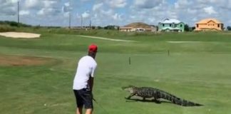 ‘ഞാനും കൂടി കൂടട്ടേ’; ഗോൾഫ് കളിക്കുന്നതിനിടെ യുവാവിന്റെ പിന്നിലെത്തി മുതല, വീഡിയോ
