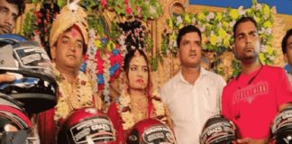 വിവാഹത്തിന് എത്തിയവർക്ക് സമ്മാനമായി ഹെൽമെറ്റ്; ദമ്പതികൾക്ക് കയ്യടി