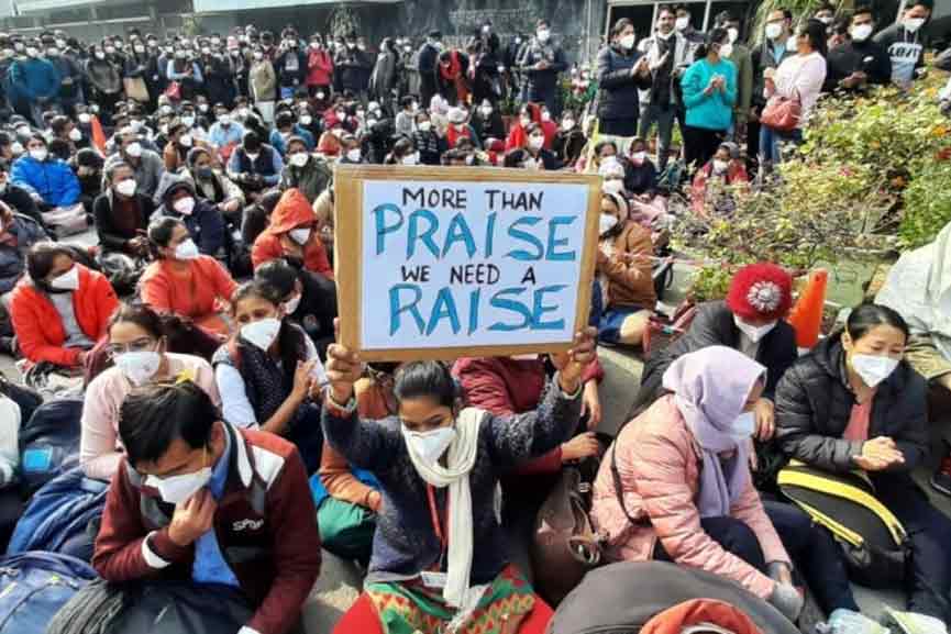 അതേസമയം, സമരത്തിനിടെ പോലീസുമായി ഉണ്ടായ സംഘർഷത്തിൽ മലയാളി നഴ്സുമാർ ഉൾപ്പടെ നിരവധി പേർക്ക് പരിക്കേറ്റു. പോലീസ് ബാരിക്കേഡ് മറിഞ്ഞു വീണാണ് ഒരു നഴ്സിന് പരിക്കേറ്റത്. പോലീസും സമരക്കാരുമായി ഉന്തും തള്ളും വാക്കേറ്റവുമുണ്ടായി. സമരമുഖത്ത് നിന്ന് നഴ്സുമാരെ നീക്കാൻ പോലീസ് ശ്രമിച്ചതാണ് സംഘർഷത്തിന് കാരണമായത്.