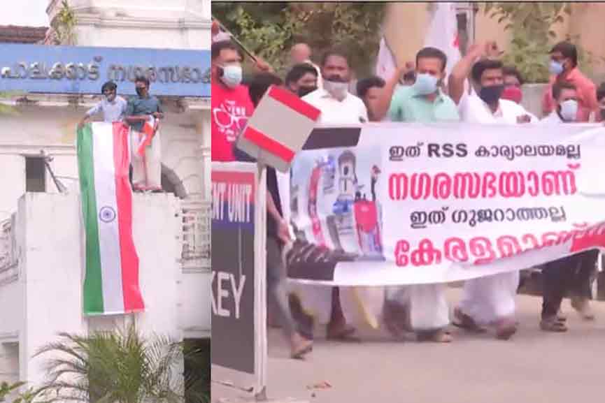 പാലക്കാട്: ബിജെപി പ്രവർത്തകർ ‘ജയ് ശ്രീറാം’ ഫ്ളക്സ് തൂക്കിയ പാലക്കാട് നഗരസഭാ കെട്ടിടത്തിൽ ഡിവൈഎഫ്ഐ പ്രവർത്തകർ ദേശീയ പതാകയുടെ ഫ്ളക്സ് ഉയർത്തി. ഇത് ആര്എസ്എസ് കാര്യാലയമല്ല നഗരസഭയാണ്, ഇത് ഗുജറാത്തല്ല, കേരളമാണ്’ എന്ന ബാനറിൽ ഡിവൈഎഫ്ഐ പ്രവര്ത്തകര് നഗരസഭയിലേക്ക് മാര്ച്ച് നടത്തുകയും നഗരസഭക്ക് മുകളില് കയറി ദേശീയ പതാക തൂക്കുകയുമായിരുന്നു. പ്രവർത്തകരെ പോലീസ് അറസ്റ്റ് ചെയ്ത് നീക്കി. ഇപ്പോള് നഗരസഭക്ക് മുന്നില് ഡിവൈഎഫ്ഐ പ്രവര്ത്തകര് കുത്തിയിരുന്നു പ്രതിഷേധിക്കുകയാണ്.