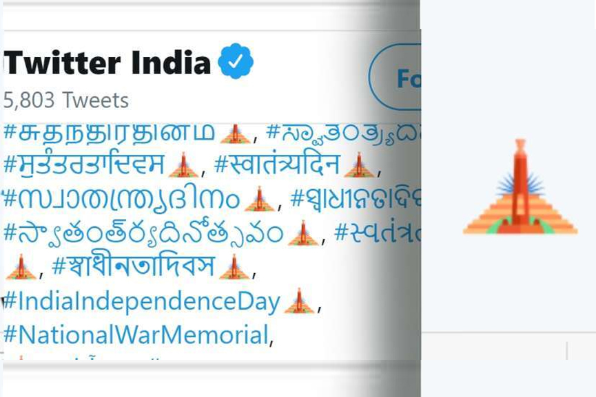 ഇംഗ്ലീഷ്, ഹിന്ദി,ഉറുദു, കന്നഡ, പഞ്ചാബി, മറാത്തി, മലയാളം, ബംഗാളി, തെലുങ്ക്, ഗുജറാത്തി, ഒറിയ എന്നീ ഭാഷകളിൽ സ്വാതന്ത്ര്യ ദിനം എന്ന് ഹാഷ്ടാഗ് ചെയ്യുമ്പോൾ ഇമോജി ലഭിക്കുമെന്ന് ട്വിറ്റർ അറിയിച്ചു. കൂടാതെ #SaluteThe Soldier, #IDAY2020, #NationalWarMemorial എന്നിവയ്ക്കൊപ്പവും ഇമോജികൾ ലഭ്യമാകും.