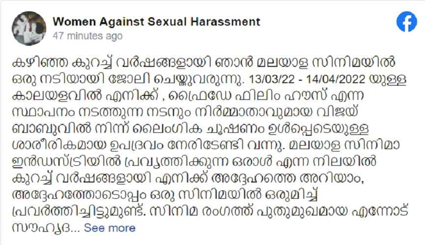 കഴിഞ്ഞ കുറച്ച് വര്ഷങ്ങളായി ഞാന് മലയാള സിനിമയില് ഒരു നടിയായി ജോലി ചെയ്തുവരുന്നു. 13/03/22 14/04/2022 യുള്ള കാലയളവില് എനിക്ക്, ഫ്രൈഡേ ഫിലിം ഹൗസ് എന്ന സ്ഥാപനം നടത്തുന്ന നടനും നിര്മാതാവുമായ വിജയ് ബാബുവില് നിന്ന് ലൈംഗിക ചൂഷണം ഉള്പ്പെടെയുള്ള ശാരീരികമായ ഉപദ്രവം നേരിടേണ്ടി വന്നു.